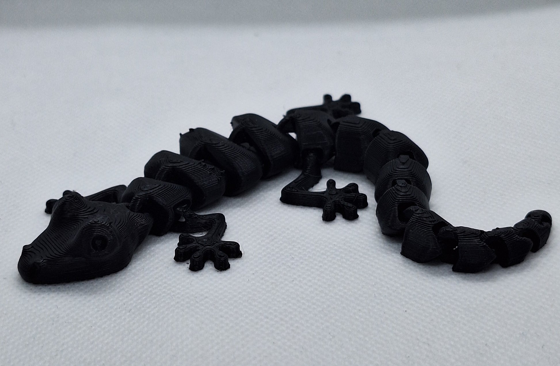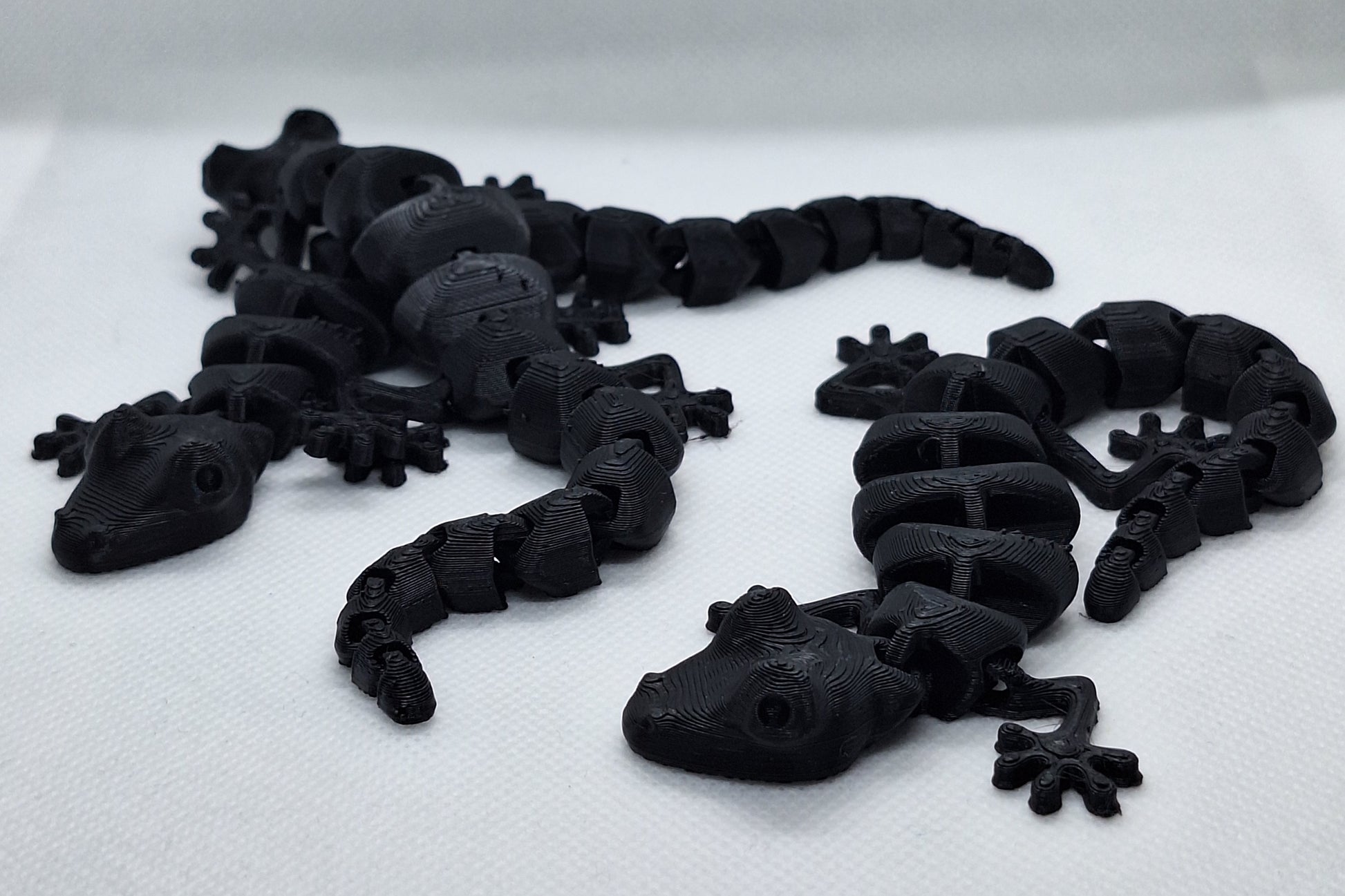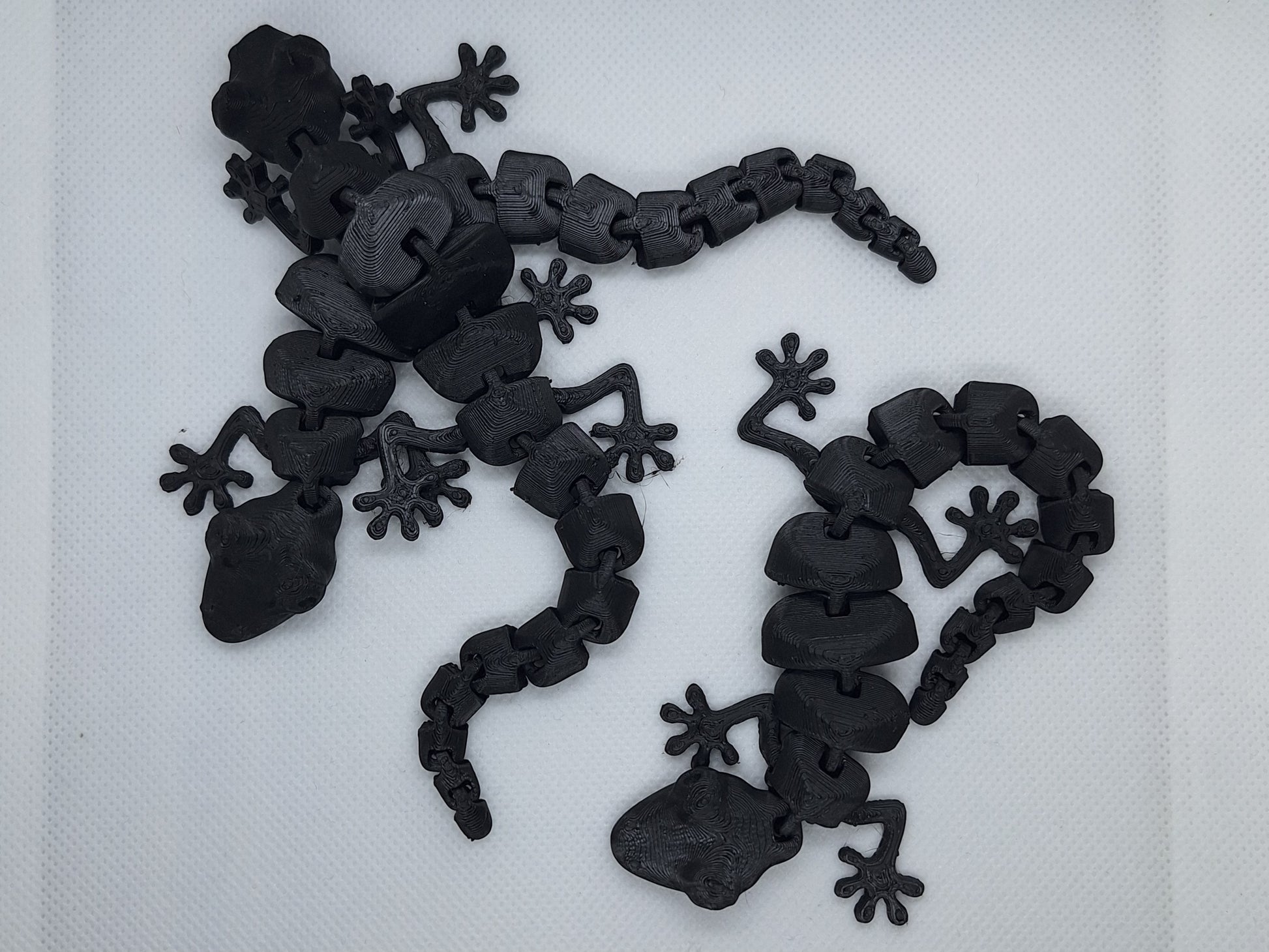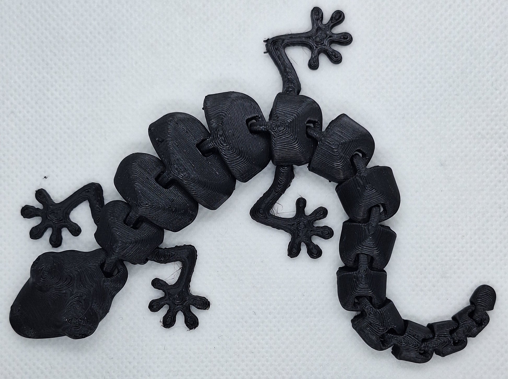 A 3D printed gecko. An articulated gecko, here in 3D printed form.